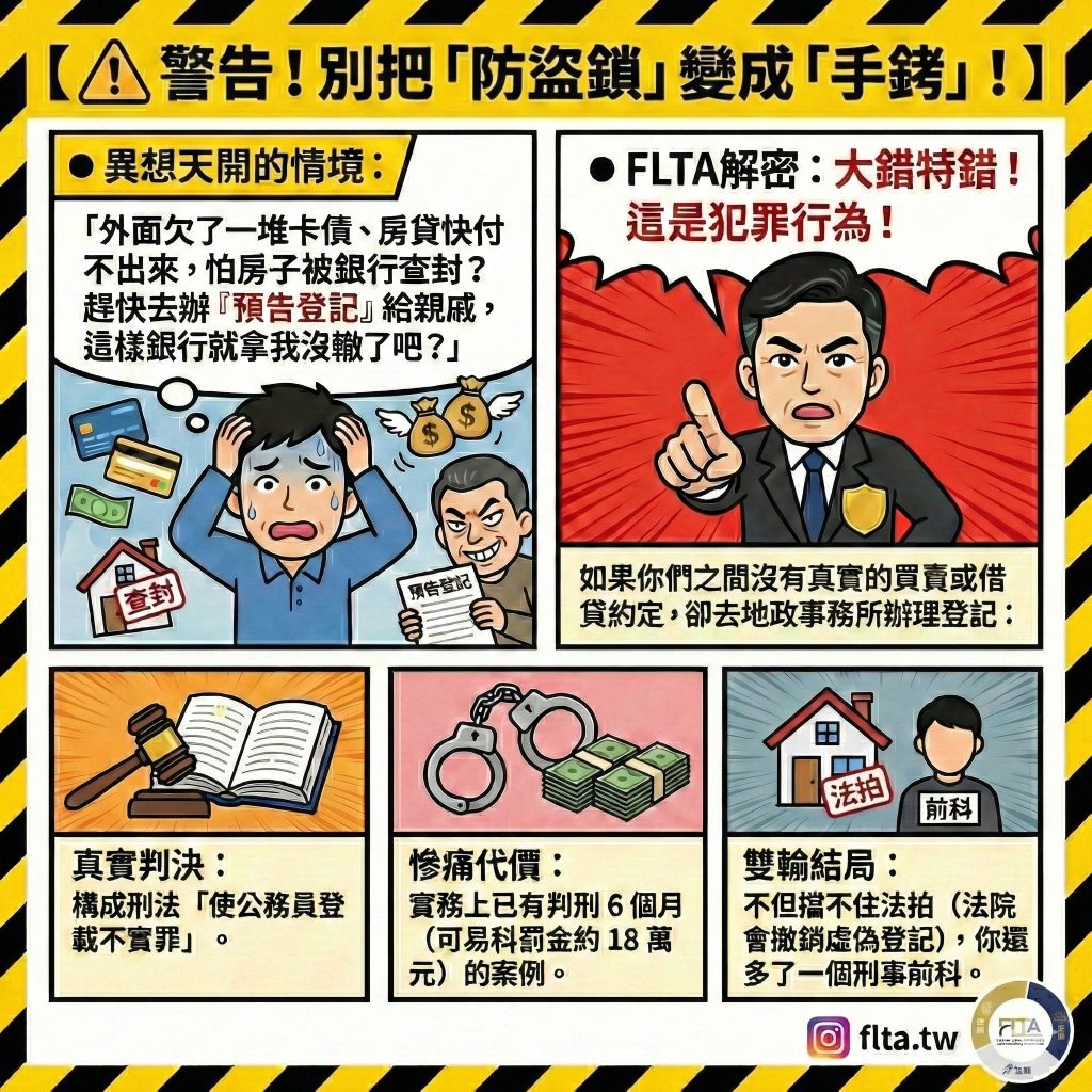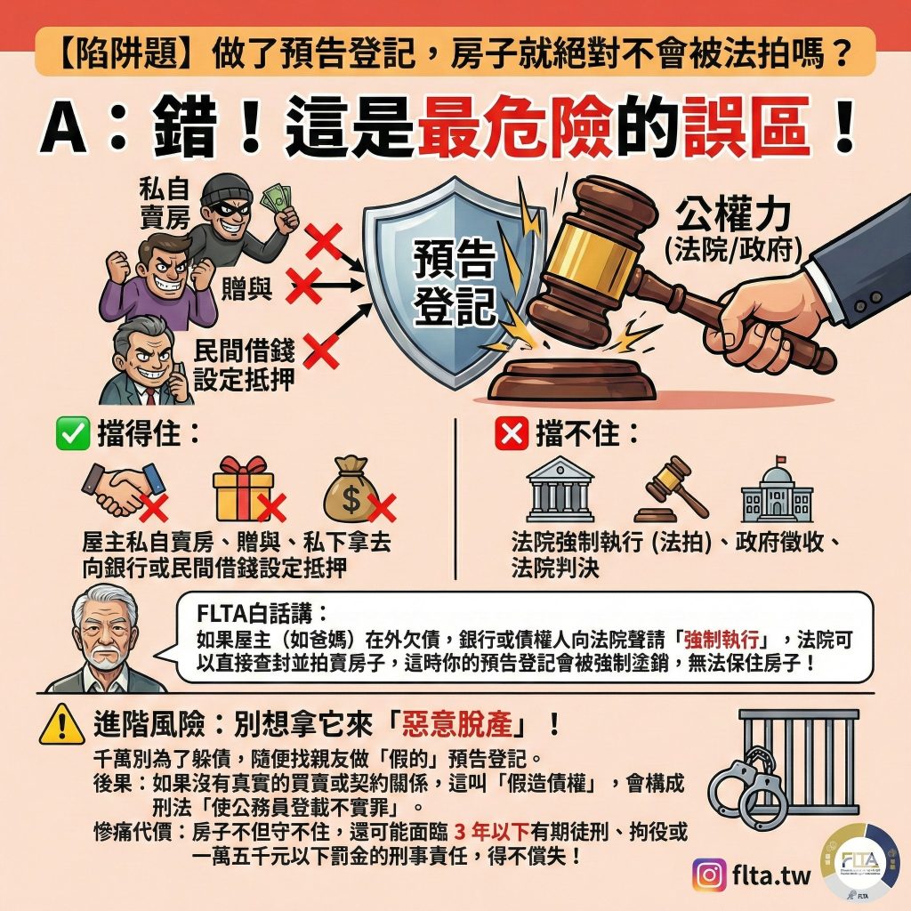 ⚠️ FLTA 法律關鍵提醒:非萬能金鐘罩:預告登記無法排除「法院判決」、「徵收」或「強制執行(法拍)」的效力 。