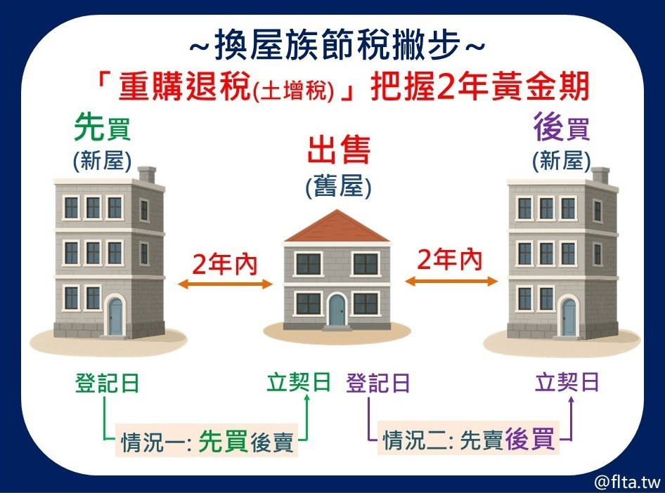 許多民眾都有換屋計劃,但出售舊屋後,會擔心須繳納高額的土地增值稅,為減輕納稅義務人的負擔,政府規定「重購自用住宅用地」可申請「退回」出售「舊屋」繳納的「土地增值稅」,減輕換屋稅負壓力。